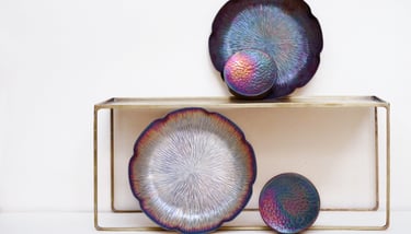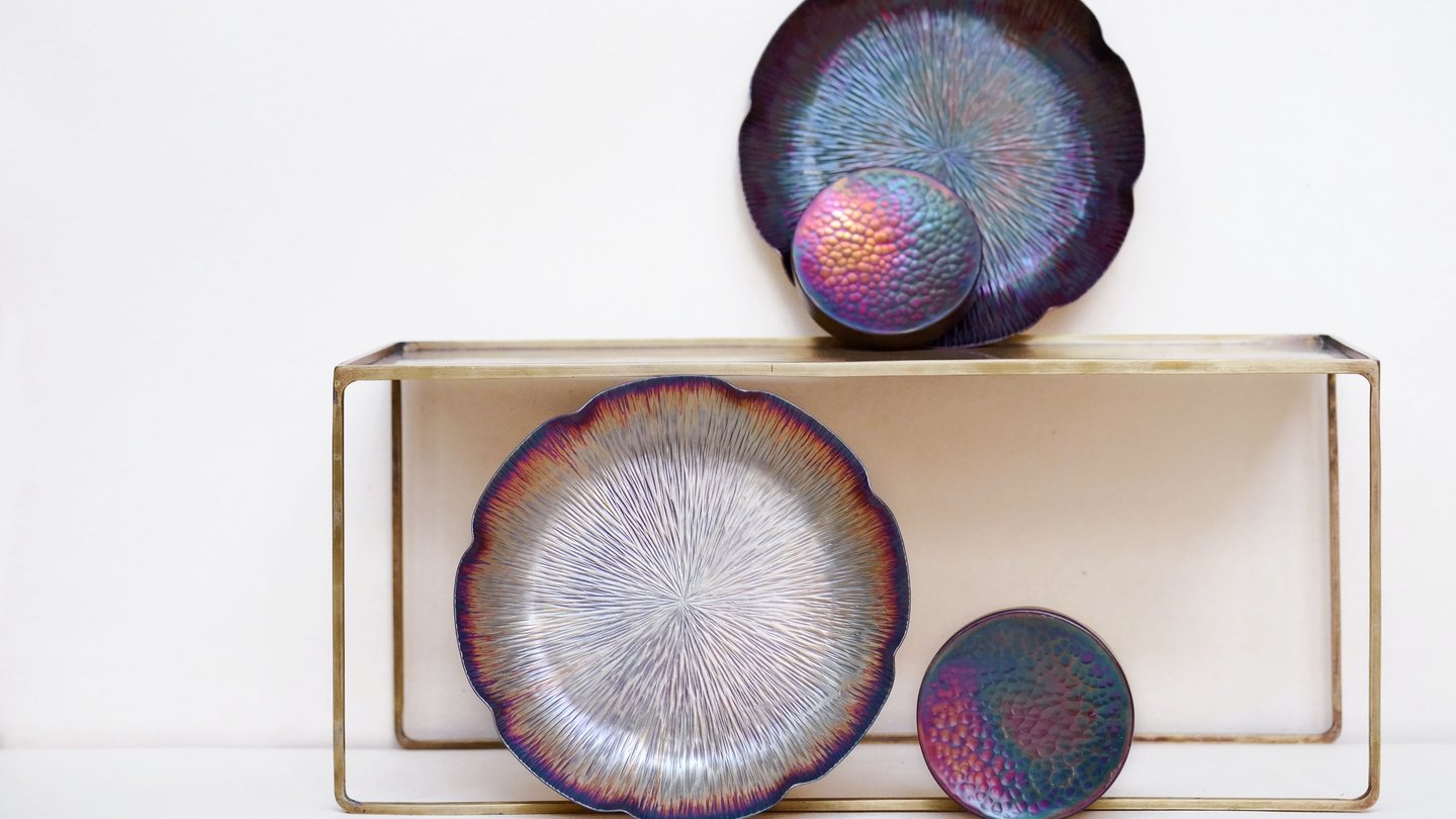 Psychedelia by Amy O’Conner is a design collection of handmade vases and other household items. O’Conner’s distinct glass finish brings a unique flair to each item, making them beautiful objects that won’t just gather dust on the mantelpiece. This set was photographed to celebrate the 15 year anniversary of the Psychedelia series.